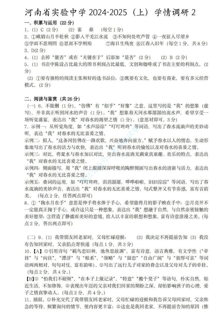 河南省实验中学2024-2025 七年级语文(上)学情调研2试卷和答案